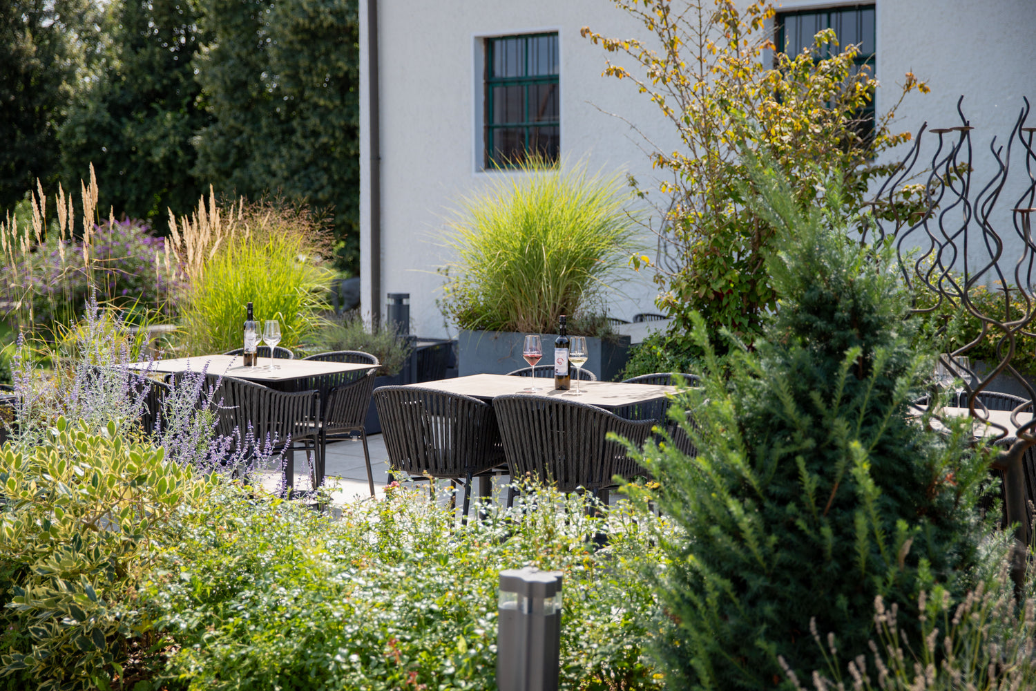Unser Gastgarten ist liebevoll bepflanzt und dekoriert. So fühlt man sich fast wie zu Hause im eigenen Garten...nur der Wein schmeckt bei uns vielleicht etwas besser.